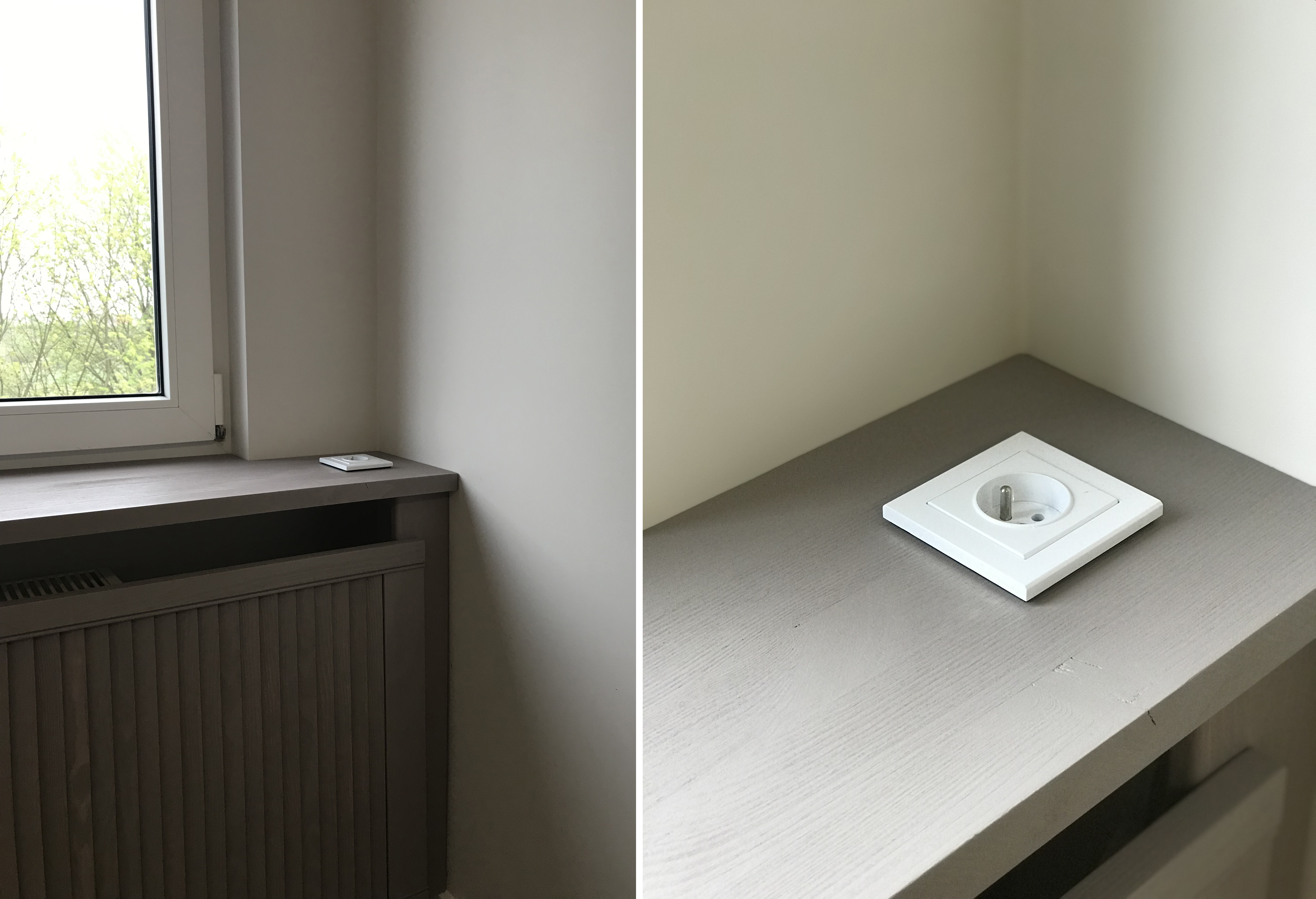 Po spasowaniu wszystkich elementów zostaje nam wykonanie otworów na gniazda, które zaprojektowaliśmy na parapecie. Z racji niewielkich wymiarów sypialni łóżko będzie stało przy maskownicy a parapet będzie zastępował stolik nocny. Będzie można tu ładować telefon czy też postawić lampkę nocną do czytania.