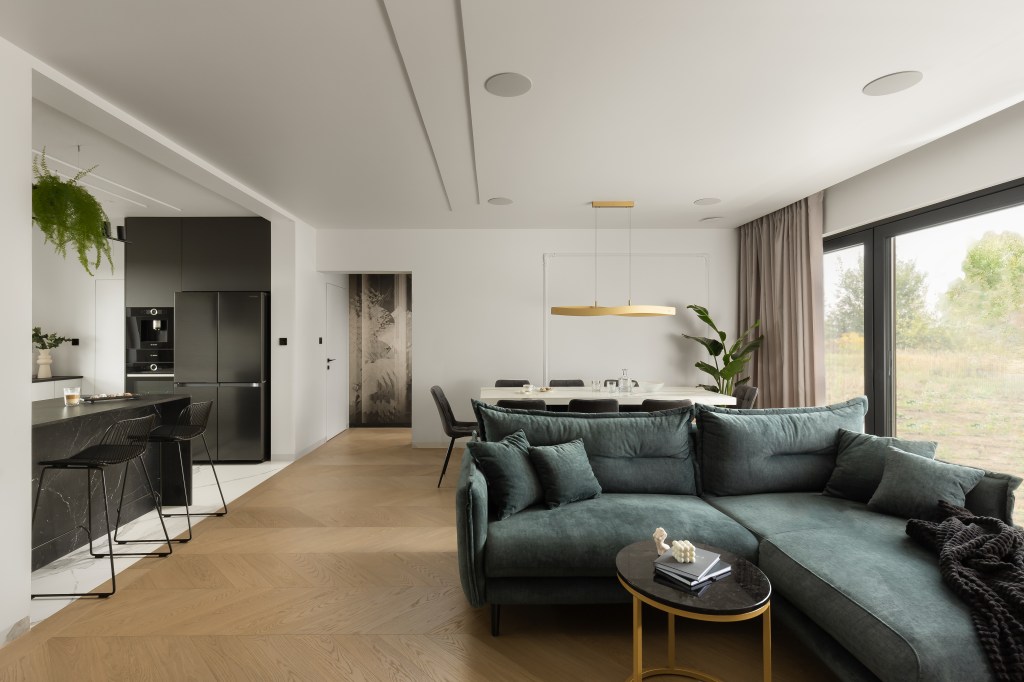 W salonie zbiera się cała rodzina, by wspólnie obejrzeć dobry film, pograć w planszówki czy po prostu pobyć ze sobą. Życie rodzinne to istota tego domu. Dlatego przestrzeń została tak pomyślana, aby wszyscy w naturalny sposób mogli, jak najwięcej czasu spędzać razem.