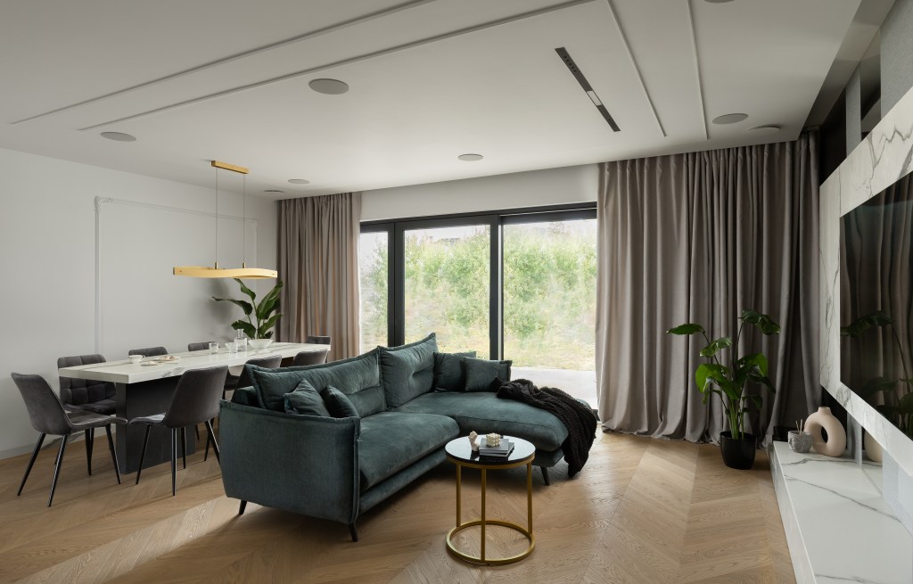 Gospodarze lubią technologiczne nowinki i gadżety ułatwiające życie. Dlatego do dużych okien, sięgających od podłogi aż po sufit, zaproponowaliśmy zasłony oraz rolety zewnętrzne sterowane elektronicznie. Wieczorem zapewniają intymność, a w ciągu dnia rozsuwają się, otwierając salon na otaczający go krajobraz – a ten zmienia się w zależności od pór roku, jak efektowna fototapeta.