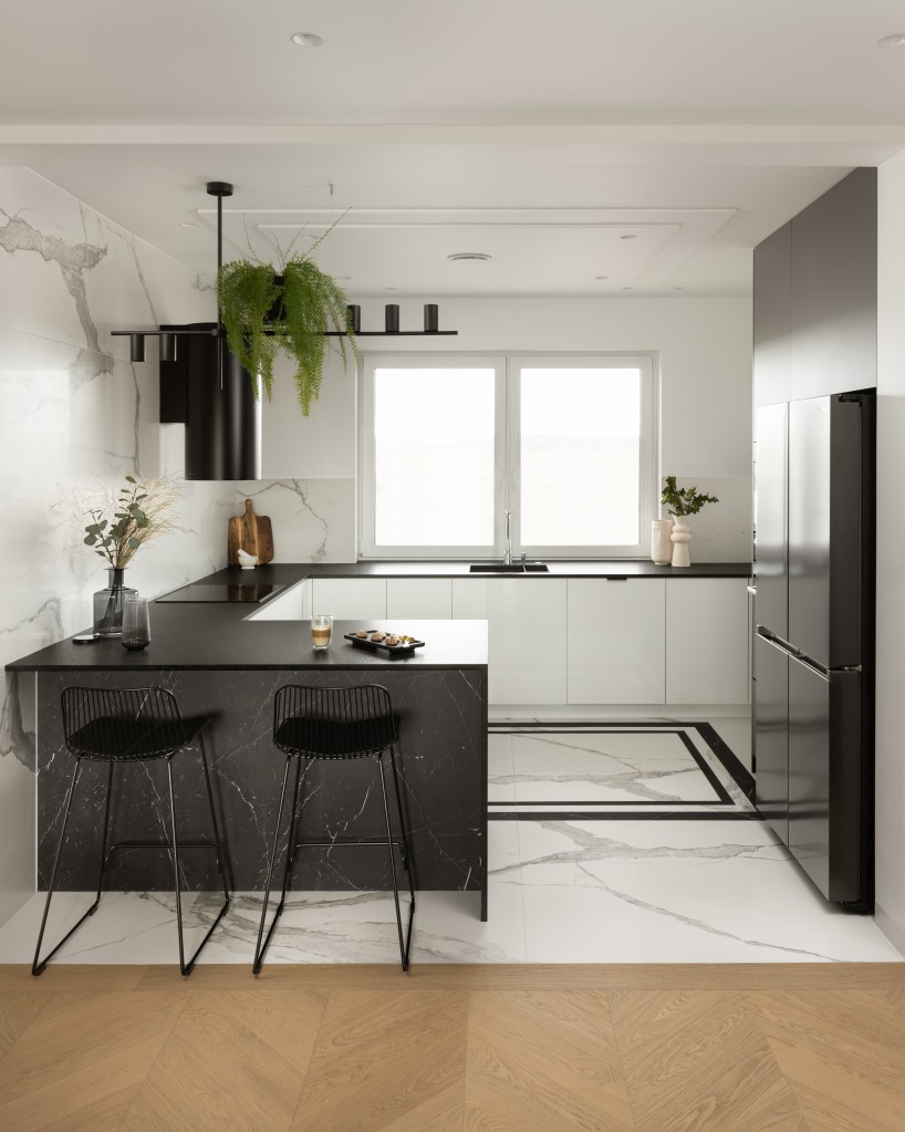 W kuchni dominują dwa kolory – ponadczasowej bieli towarzyszy klasyczna czerń. Na podłodze jasny spiek z pięknym szarym rysunkiem, urozmaica czarna ramka. Spieki pojawiają się także na zabudowie meblowej oraz na ścianie. Ten materiał świetnie sprawdza się w kuchni – pod względem praktyczności przewyższa naturalny kamień, a imituje go fantastycznie.