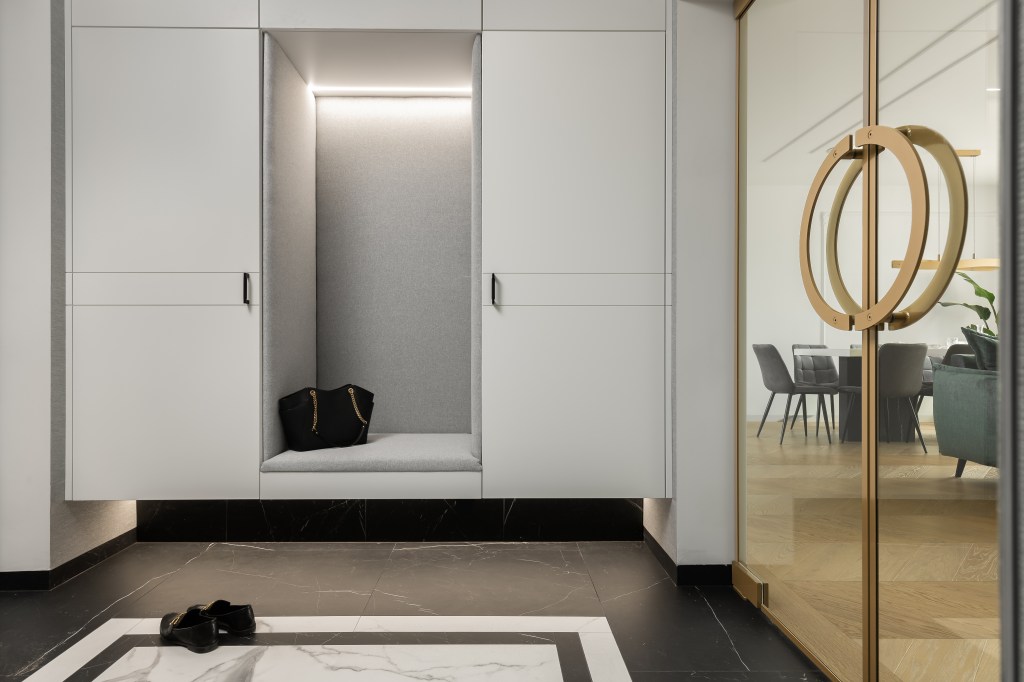 CIEKAWY POMYSŁ NA PRZEDPOKÓJ Z PODWIESZANYMI SZAFAMI W ZABUDOWIE
