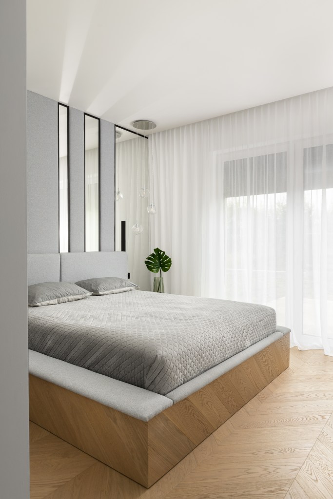 W sypialni gospodarzy nie ma ich co prawda za wiele, ale klimat buduje dekoracyjna ściana za łóżkiem obłożona jasnoszarą tapicerką. Miękkie panele przenikają się z rytmicznie ułożonymi lustrami, w których przegląda się całe pomieszczenie.