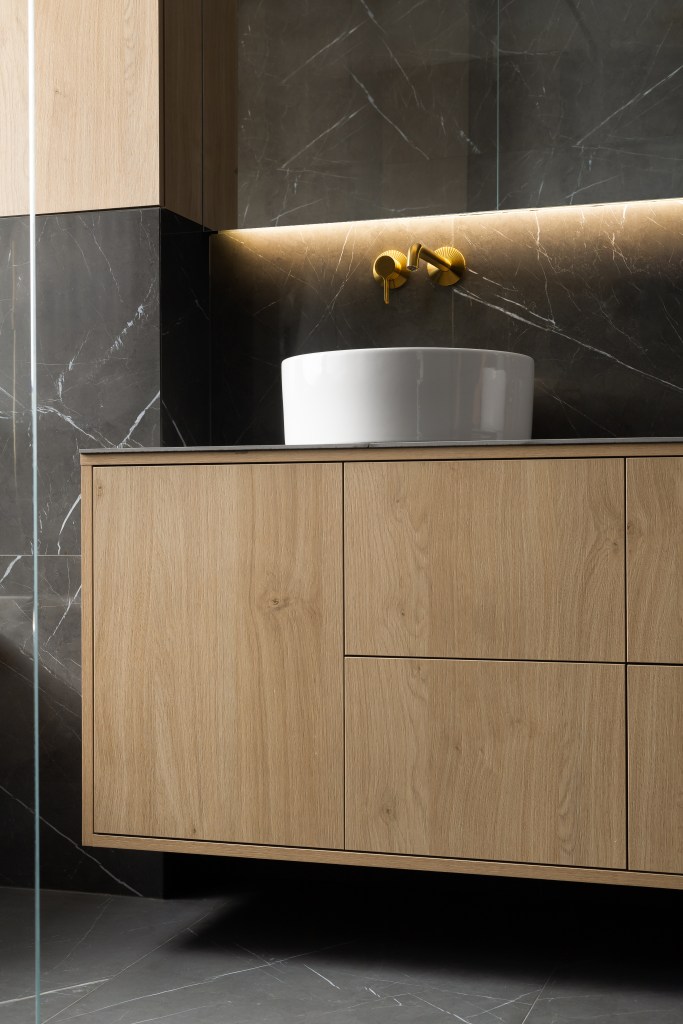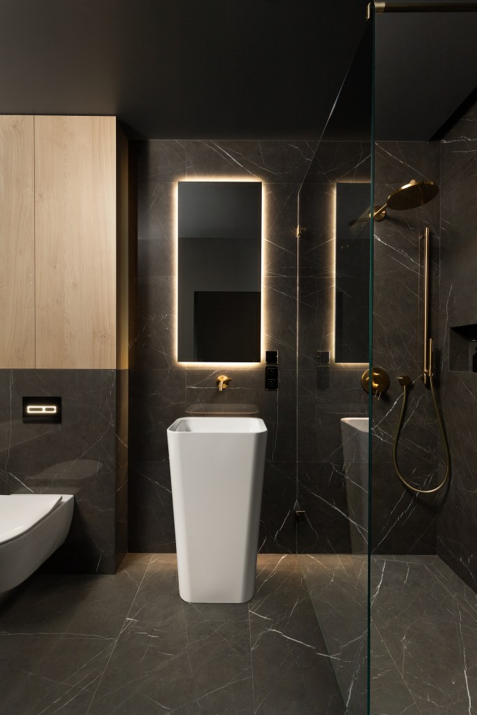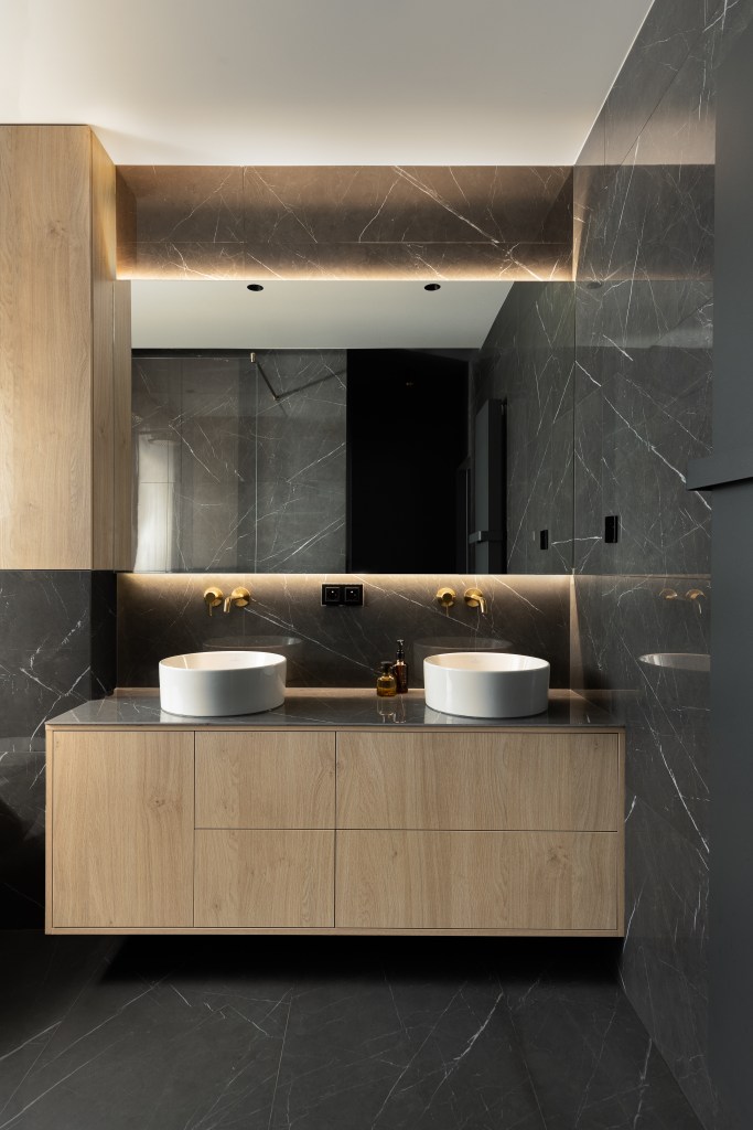 Całość ładnie komponuje się z białą ceramiką oraz bateriami ze w odcieniu szczotkowanego mosiądzu. Do umywalek wybrany został jednouchwytowy model podtynkowy z serii AXOR One – z prostą wylewką i mieszaczem. Wygląda bardzo estetycznie i nie zaburza minimalistycznych tafli wielkoformatowych spieków.