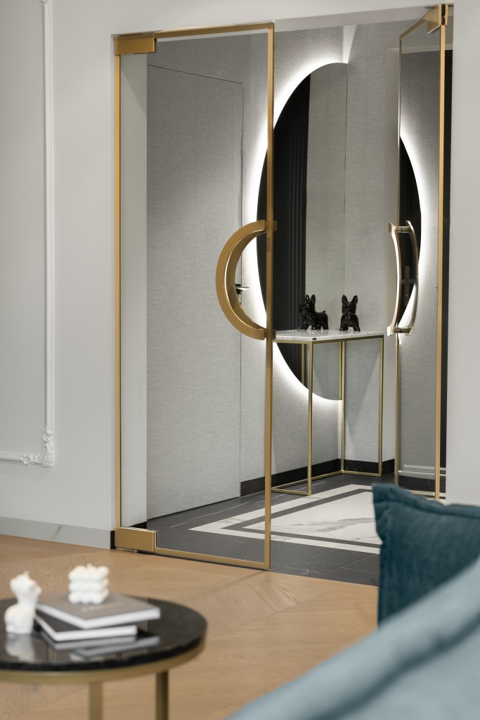 Naprzeciwko szaf znalazła się przestrzeń na duże okrągłe lustro i zgrabną konsolę na podręczne drobiazgi. Praktyczną, bo łatwą do utrzymania w czystości podłogę, wykończono wielkoformatowym spiekiem z ładnym użyleniem imitującym szlachetny marmur.