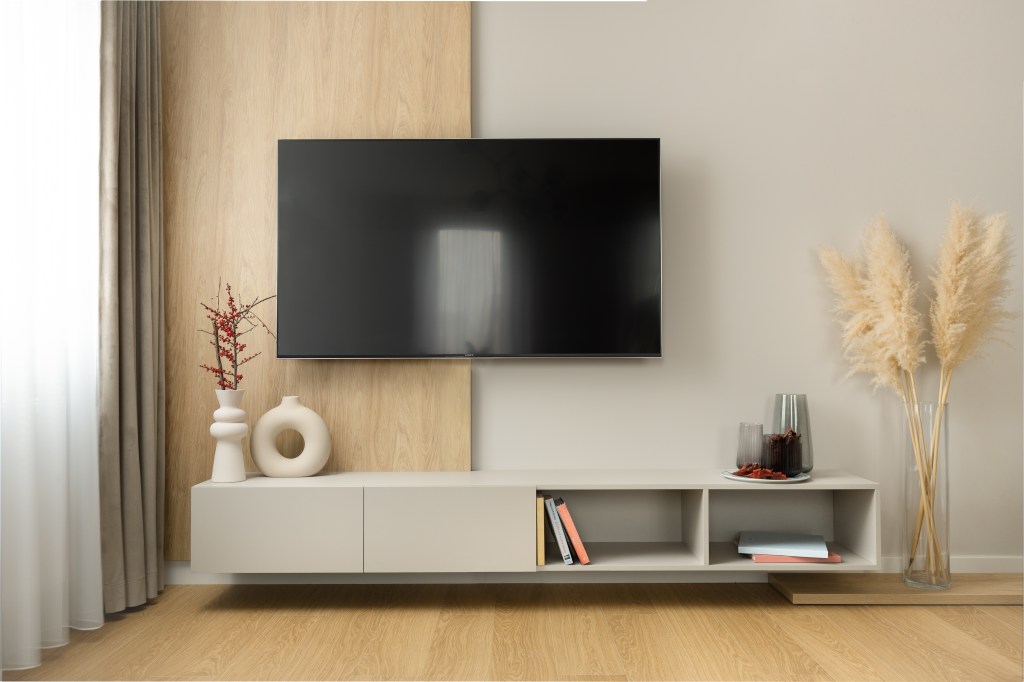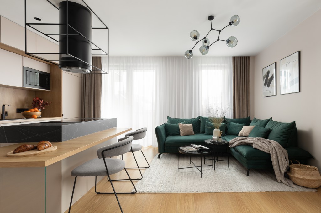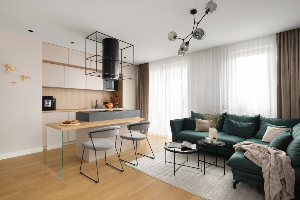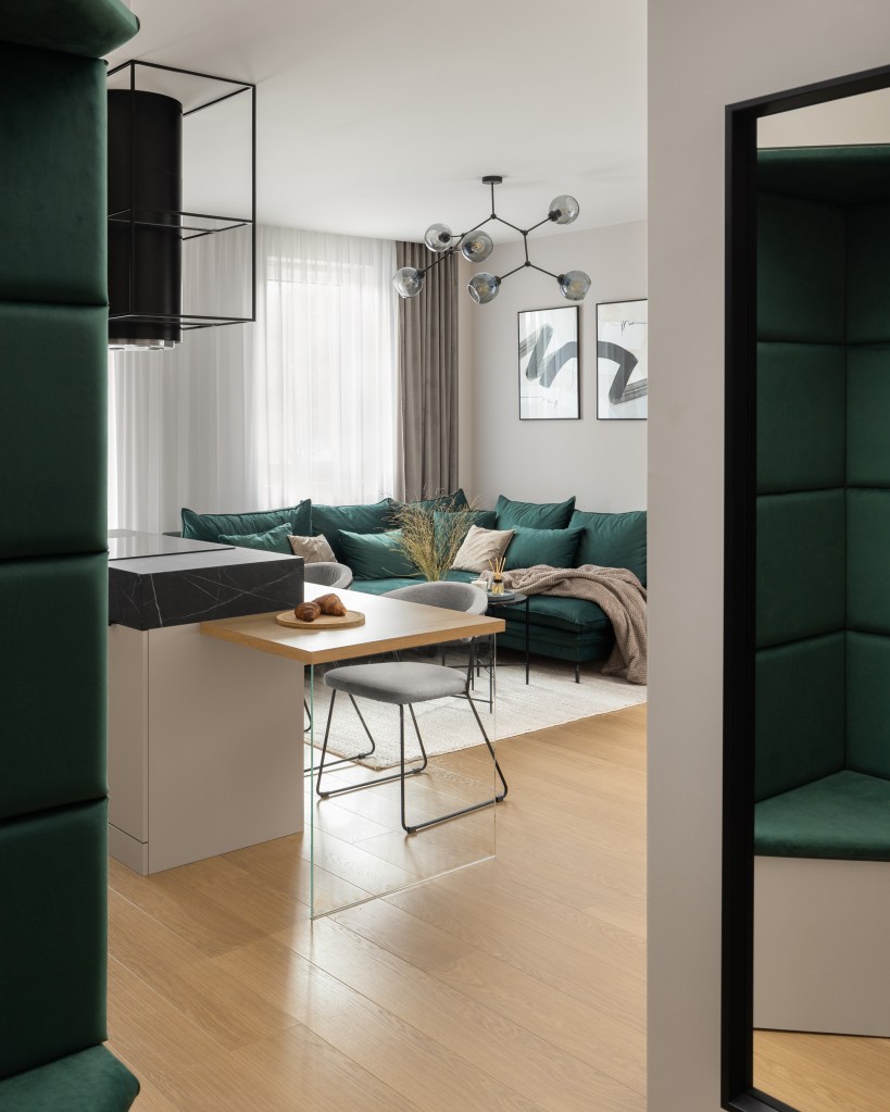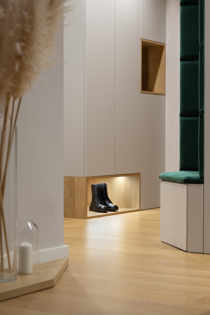 Głównym założeniem projektowym w salonie miało być wyciśnięcie jak największej przestrzeni z dużą ilością miejsc do przechowywania, które udało się uzyskać w przestrzeni kuchennej. Niezależnie od metrażu, w którym mieszkamy ilość rzeczy do składowania stale rośnie. Im więcej sprytnie zaprojektowanych schowków tym lepiej. Tak jest i w tym przypadku. Natomiast sam salon utrzymany jest w jasnych tonach, dominuje kolor taupe z drewnianymi elementami. Wyraźnym akcentem kolorystycznym jest zieleń. Pojawia się ona zarówno na kanapie oraz siedzisku w łączniku z komunikacją. Na podłodze jest wysokiej jakości panel, który wygrał z deską naturalną ze względów eksploatacyjnych. Dywan z plecionej wełny sprzyja wypoczynkowi. A owalne, czarne stoliki o różnej wysokości na jego tle ładnie odcinają się kolorystycznie. Zasłony są w ciepłym odcieniu i nadają domowego klimatu. Z racji, że mieszkanie znajduje się na parterze zaprojektowano zasłony z woalu, które pozwalają doświetlić wnętrze a równocześnie mamy komfort swobodnego poruszania się we nim. Za kanapą są odpowiednie grafiki, które dodają sznytu całości. Ściana telewizyjna jest stonowana a cały drewniany element podkreśla pionowe, nastrojowe oświetlenie.