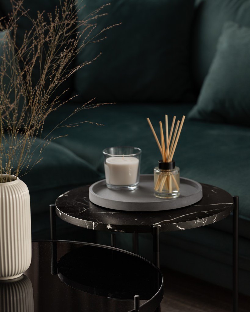 Dodatki to biżuteria wnętrza. W najbardziej widocznym miejscu cieszą oko mosiężne kolibry od Papdeco, które są wykonane ręcznie z odpowiednio dobranym stopniem patynowania. Obrazy na ścianie to grafiki o wyraźnych kolorach i stanowczych kształtach od firmy Desenio. Wazony zostały upolowane w H&M Home. Są one w kolorach spójnych z całym wnętrzem. Dywan z plecionej wełny wybrany został z względu na kolor oraz przyjazny wypoczywaniu materiał.