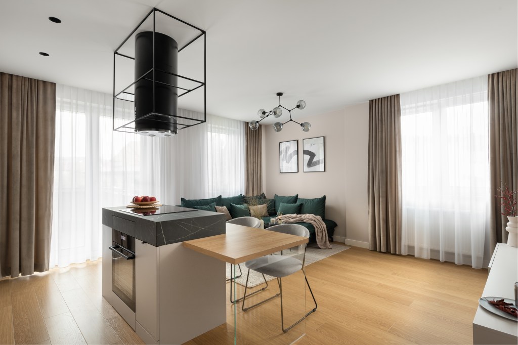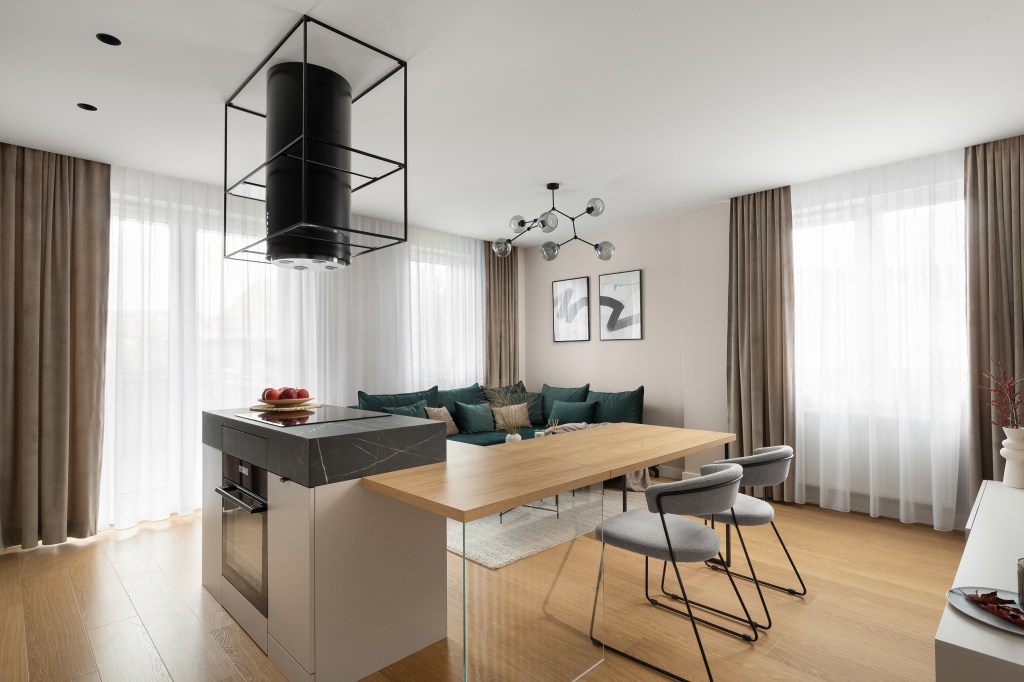 Na pewno wartym elementem, o którym należy wspomnieć jest wyspa z zintegrowanym stołem śniadaniowym, który w zależności od potrzeb możemy przedłużyć mobilnym elementem blatu, który wsparty jest na składanej, spawanej, czarnej nodze. Na co dzień stół śniadaniowy wsparty jest na szklanym podparciu, które nadaje lekkości i przestronności wnętrzu i nie zajmuje dużej ilości miejsca, która jest tu na wagę złota.
