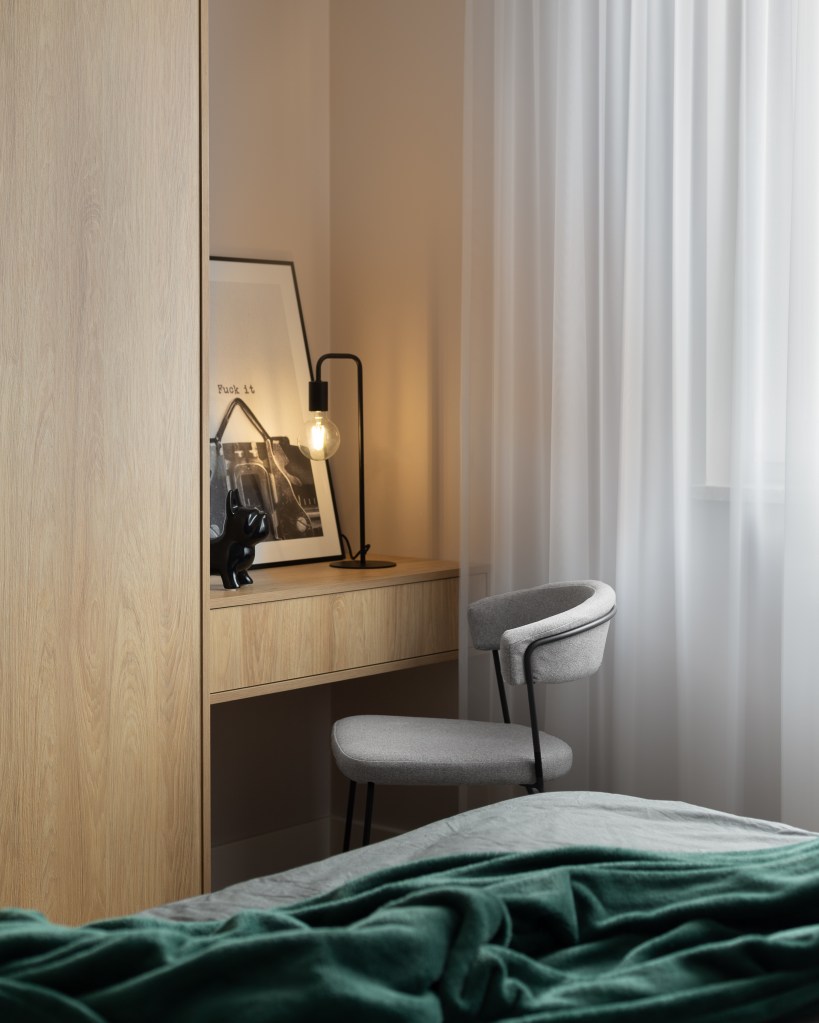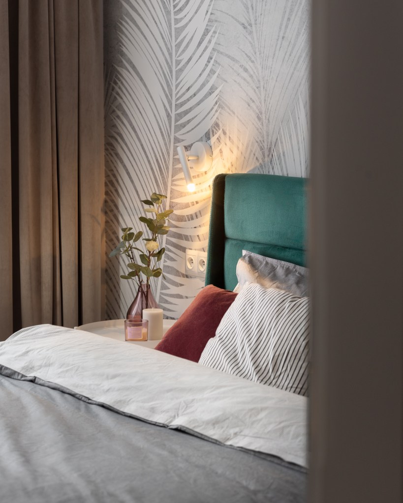 W głównym miejscu jest łóżko z tapicerowanym, zielonym wezgłowiem. Za nim na tapecie pojawia się motyw roślinny. Kinkiety i stoliki nocne są białe co nadaje lekkości i jest spójne z jasną tapetą. W rogu po przeciwnej stronie znajduje się kącik do pracy zdalnej, który przechodzi w sporą szafę.