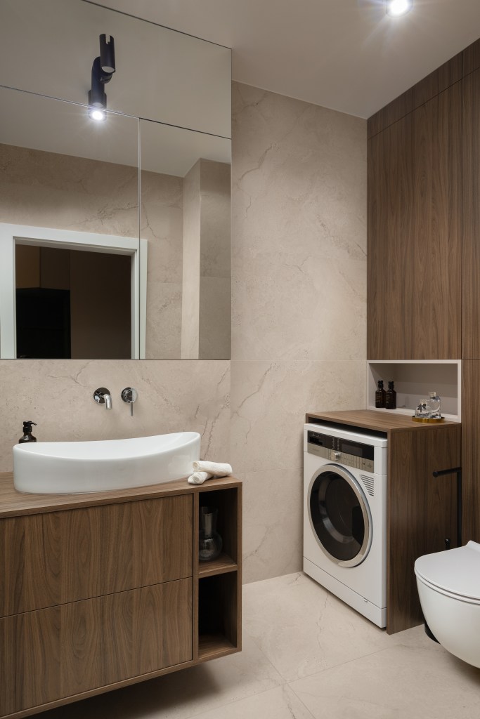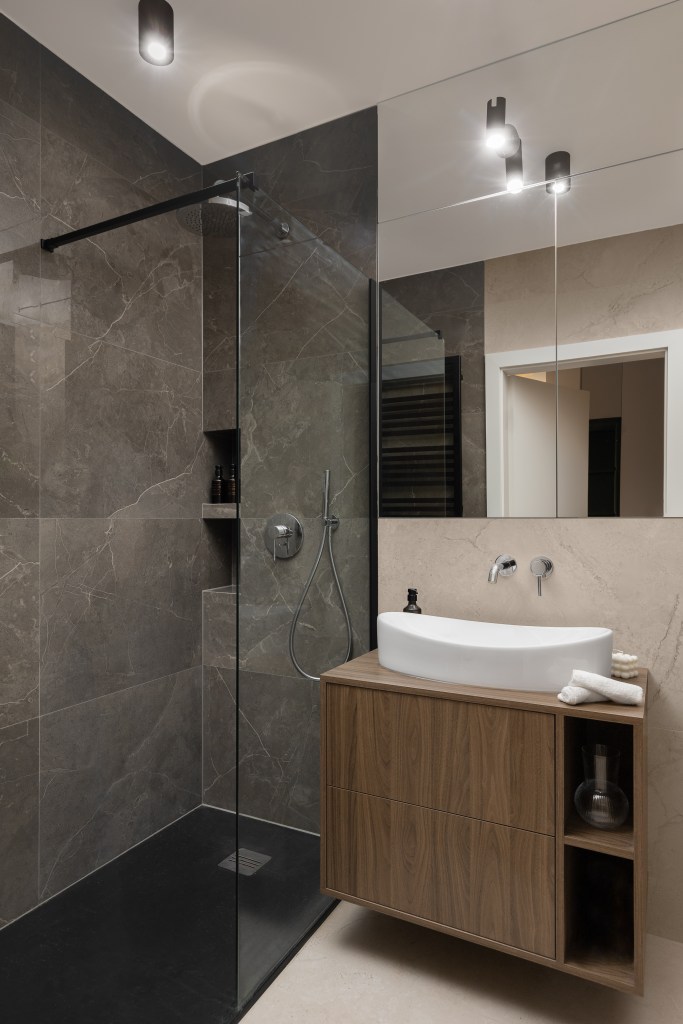 Łazienka miała być przestrzenna na tyle, ile pozwala jej metraż. Dlatego aby zmieścić całe założenie zdecydowaliśmy się na prysznic walk-in. Jego strefa jest w ciemniejszej płytce o delikatnym spękaniu. Natomiast jasna jest delikatnie płomieniowana. Żeby powiększyć przestrzeń lustro zostało zastosowane zarówno na szafce nad umywalką jak też na kominie. Zabudowa wc wykonana jest z tego samego materiału co szafka podumywalkowa. Zostało tam też schowane miejsce do przechowywania.