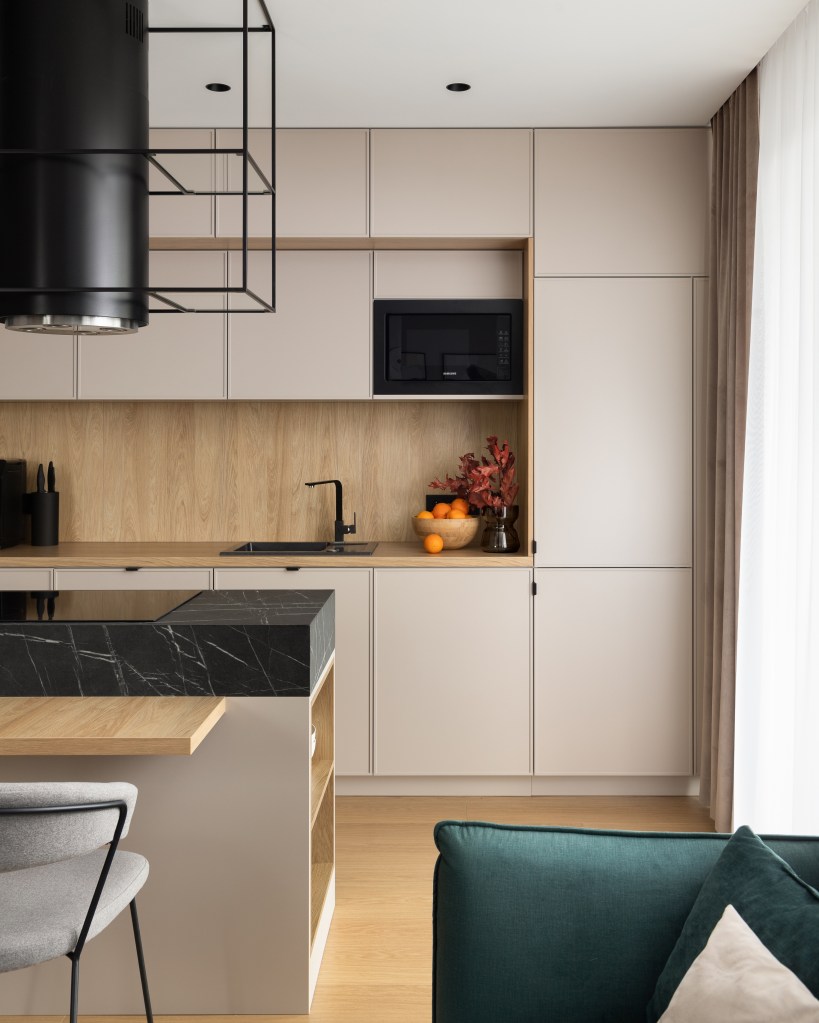 Wyspa jest sercem mieszkania. Udało się tu wbudować stół śniadaniowy, który możemy także wydłużyć. Blat wyspy jest z materiału z powłoką anti-finger a sam stół śniadaniowy oraz blat głównej części kuchni drewniany. Nad wyspą znajduje się okap dekoracyjny oraz podwieszana półka spawana. Fronty zabudowy kuchennej są w kolorze taupe z delikatną wyfrezowaną ramką. Otwieranie większości z nich jest na tip-on. Jedynie uchwyt lodówki i zmywarki ma delikatny uchwyt krawędziowy. Zabudowa kuchni płynnie przechodzi zabudowę siedziska, która jest w tym samym kolorze wraz ze ścianami.